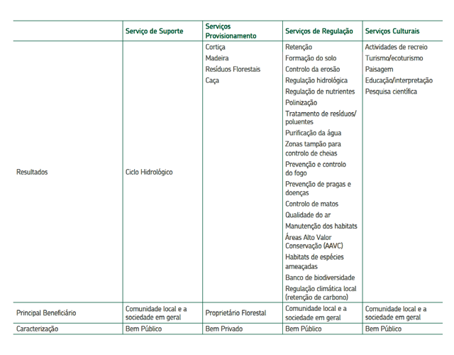 Ao nível dos serviços de provisionamento os principais beneficiários são os proprietários florestais, classificando-se os serviços como "bens privados". Os restantes serviços beneficiam sobretudo as Comunidades locais e a Sociedade em geral, denominados por "bens públicos".
